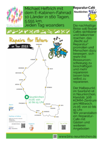 Repairs for Future ist on Tour! Der engagierte Reparatur-Geselle Michel Heftrich startete am 23. März 2023 seine Tour mit seinem Vollkabinen-Fahrrad u.a. nach Deutschland, Dänemark, in die Niederlande. Das Ziel ist es, bei über 50 Repair Cafés entlang der 5555km langen Strecke gemeinsam mit Besucher*innen der Repair Cafés so viele Geräte zu reparieren, so viele Repair Cafés zu besuchen und so viele engagierte Menschen zu treffen wie möglich. So sollen alternative Konsummodelle vorgelebt werden.
